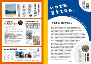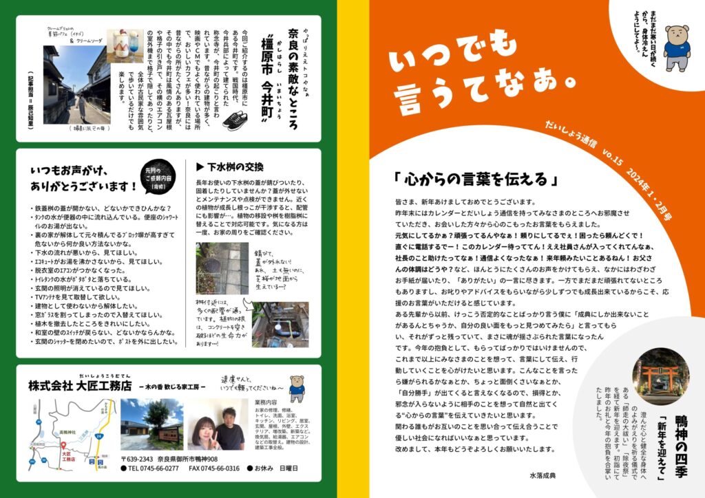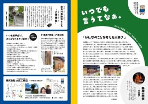 大匠工務店では、お世話になっているお客さまへ、隔月でニュースレターをお届けしています。タイトルの「いつでも言うてなぁ。」は、どんなに小さなことでもいいから我慢せずに声をかけてほしい、頼ってほしい、という想いを込めて付けさせてもらいました。