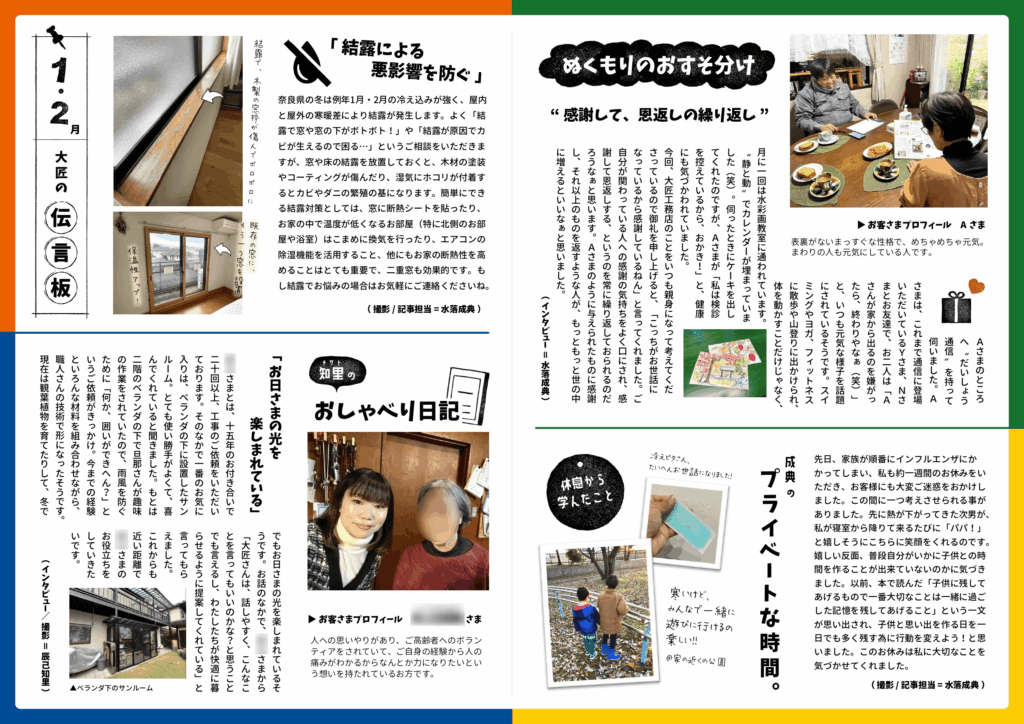 大匠工務店では、お引き渡しからのお付き合いを大切にしたいという想いから、ご縁をいただいたお客さま(OB様)へ向けて隔月でニュースレター「いつでも言うてなあ。」を発行しています。