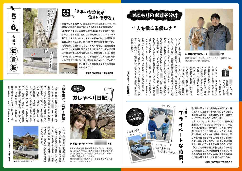 大匠工務店では、お引き渡しからのお付き合いを大切にしたいという想いから、ご縁をいただいたお客さま(OB様)へ向けて隔月でニュースレター「いつでも言うてなあ。」を発行しています。
