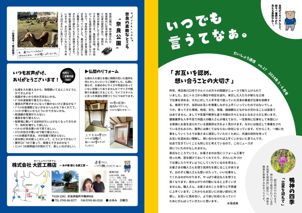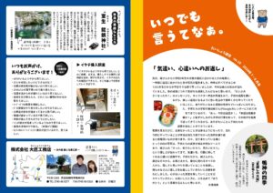 大匠工務店では、お世話になっているお客さまへ、隔月でニュースレターをお届けしています。タイトルの「いつでも言うてなぁ。」は、どんなに小さなことでもいいから我慢せずに声をかけてほしい、頼ってほしい、という想いを込めて付けさせてもらいました。
