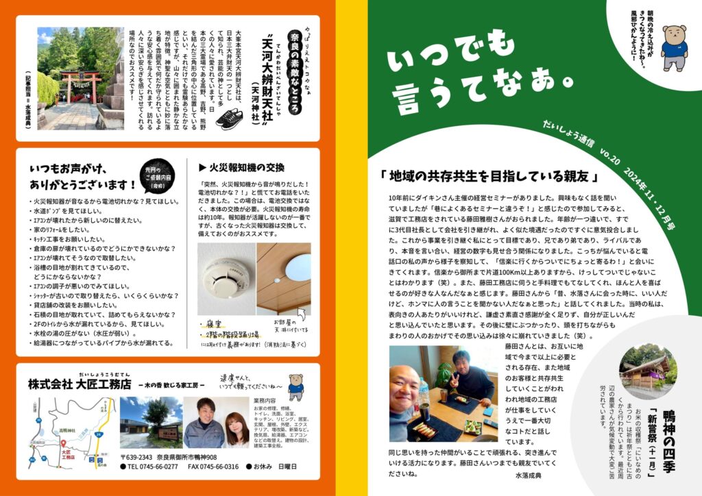 大匠工務店では、お世話になっているお客さまへ、隔月でニュースレターをお届けしています。タイトルの「いつでも言うてなぁ。」は、どんなに小さなことでもいいから我慢せずに声をかけてほしい、頼ってほしい、という想いを込めて付けさせてもらいました。