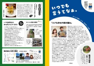 大匠工務店では、お世話になっているお客さまへ、隔月でニュースレターをお届けしています。タイトルの「いつでも言うてなぁ。」は、どんなに小さなことでもいいから我慢せずに声をかけてほしい、頼ってほしい、という想いを込めて付けさせてもらいました。