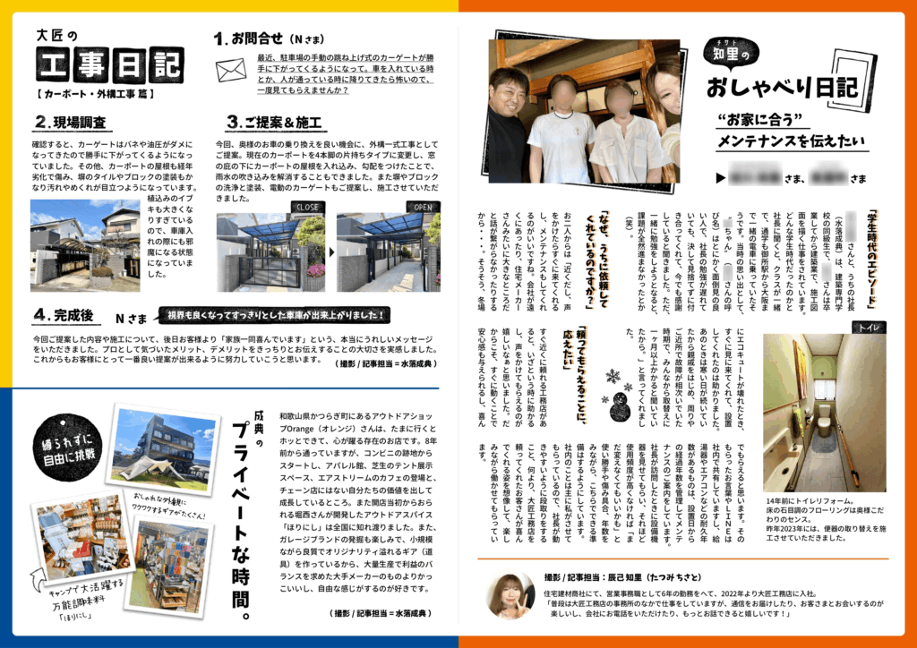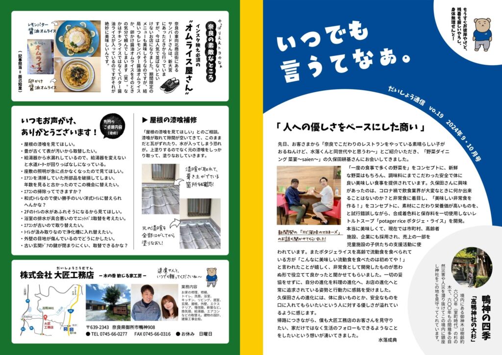 大匠工務店では、お世話になっているお客さまへ、隔月でニュースレターをお届けしています。タイトルの「いつでも言うてなぁ。」は、どんなに小さなことでもいいから我慢せずに声をかけてほしい、頼ってほしい、という想いを込めて付けさせてもらいました。