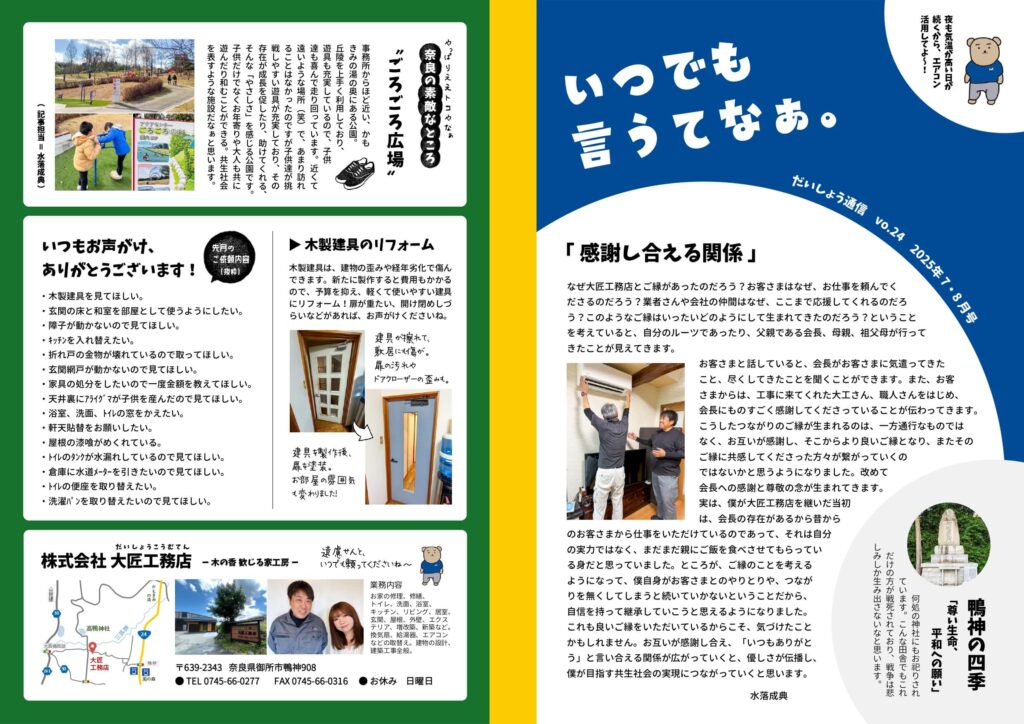 大匠工務店では、お世話になっているお客さまへ、隔月でニュースレターをお届けしています。タイトルの「いつでも言うてなぁ。」は、どんなに小さなことでもいいから我慢せずに声をかけてほしい、頼ってほしい、という想いを込めて付けさせてもらいました。
