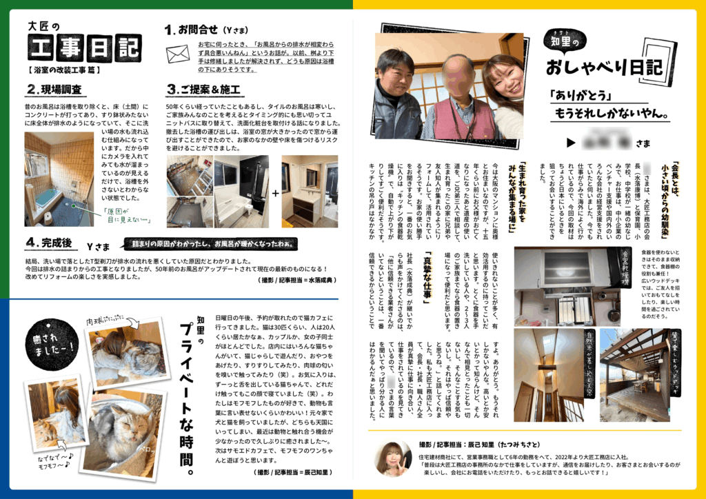 大匠工務店では、お引き渡しからのお付き合いを大切にしたいという想いから、ご縁をいただいたお客さま(OB様)へ向けて隔月でニュースレター「いつでも言うてなあ。」を発行しています。