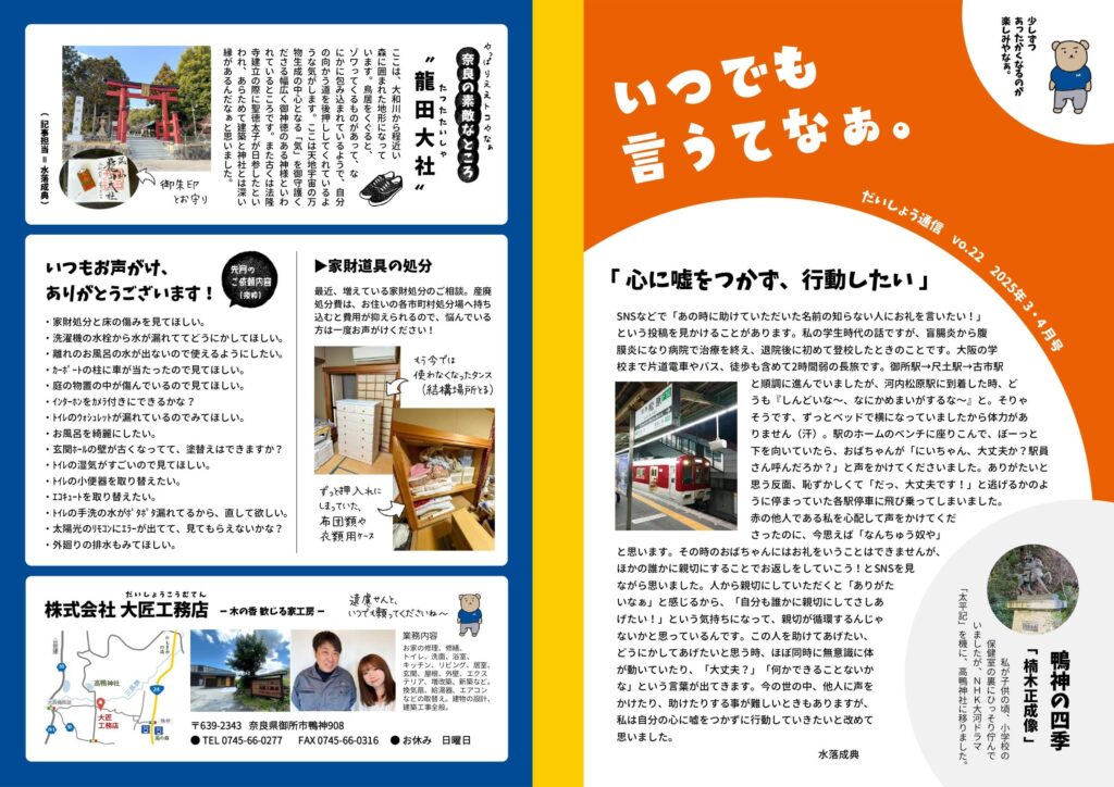 大匠工務店では、お世話になっているお客さまへ、隔月でニュースレターをお届けしています。タイトルの「いつでも言うてなぁ。」は、どんなに小さなことでもいいから我慢せずに声をかけてほしい、頼ってほしい、という想いを込めて付けさせてもらいました。