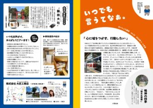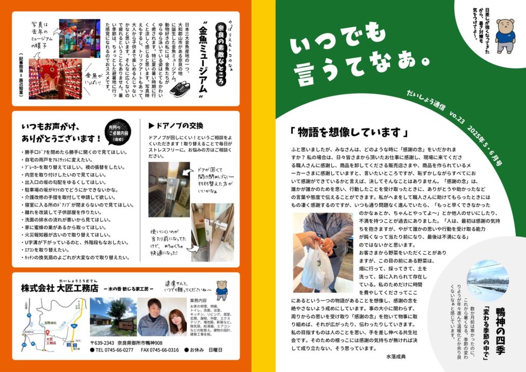 大匠工務店では、お世話になっているお客さまへ、隔月でニュースレターをお届けしています。タイトルの「いつでも言うてなぁ。」は、どんなに小さなことでもいいから我慢せずに声をかけてほしい、頼ってほしい、という想いを込めて付けさせてもらいました。