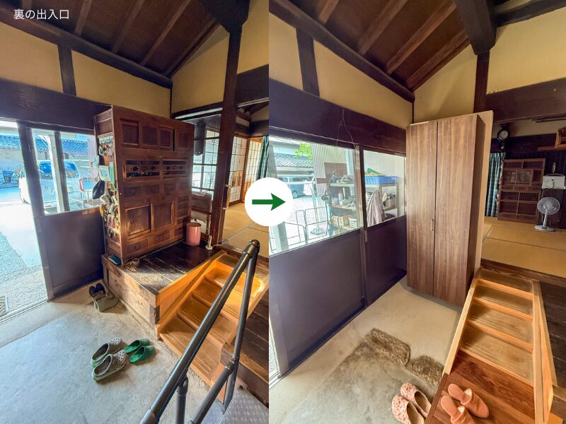 下足入れは玄関側ではなく、裏の出入り口側へ配置。