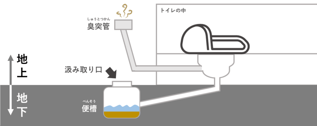 U様邸のトイレは、「汲み取り式」という構造のトイレ。水道や下水道につながっておらず、排泄物は便器の下にある「便槽(べんそう)」と呼ばれるタンクに直接落としてためます。「ぼっとん便所」「ぼっとんトイレ」と呼ばれることもあります。