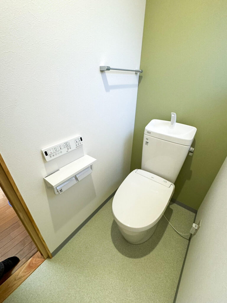 とくに奥様が喜んでくださっていたそうで、今回のクロスのデザインや色の選定時も、少しアドバイスもさせていただきながら、奥様が好きな色を決めておられました。清潔感はもちろん。床と奥の壁をグリーンにされたことで、トイレの空間がスッキリと見えますね。お気に入りのトイレ空間が実現して、良かったです!